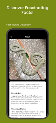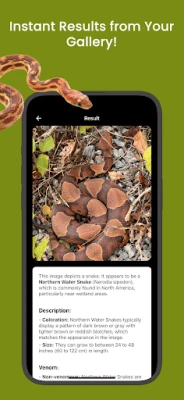 - Instant Identification: Quickly identify snakes and other reptiles with just a snap or upload. - Comprehensive Database: Access detailed descriptions and fascinating facts about various species. - User-Friendly Interface: Intuitive design for easy navigation and use. - Educational Tool: Enhance your knowledge and appreciation of reptiles with accurate information. - Log and save each image you take.
